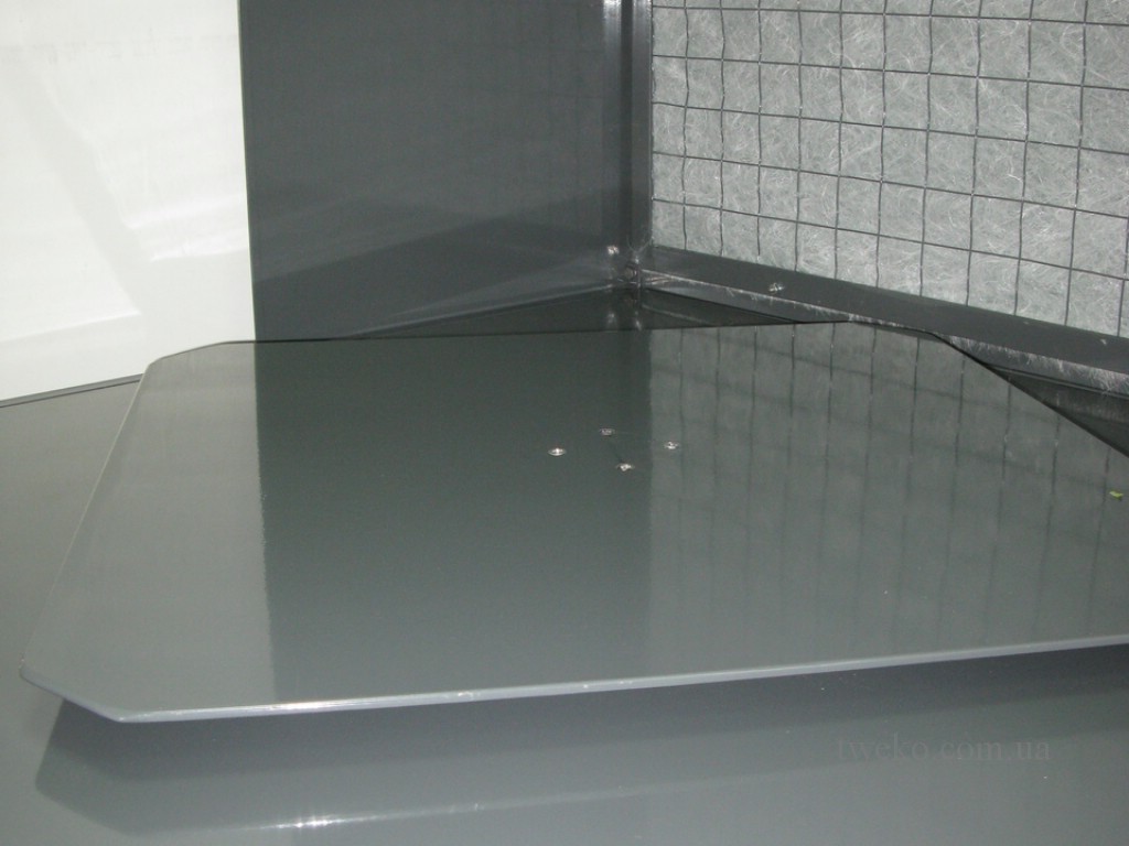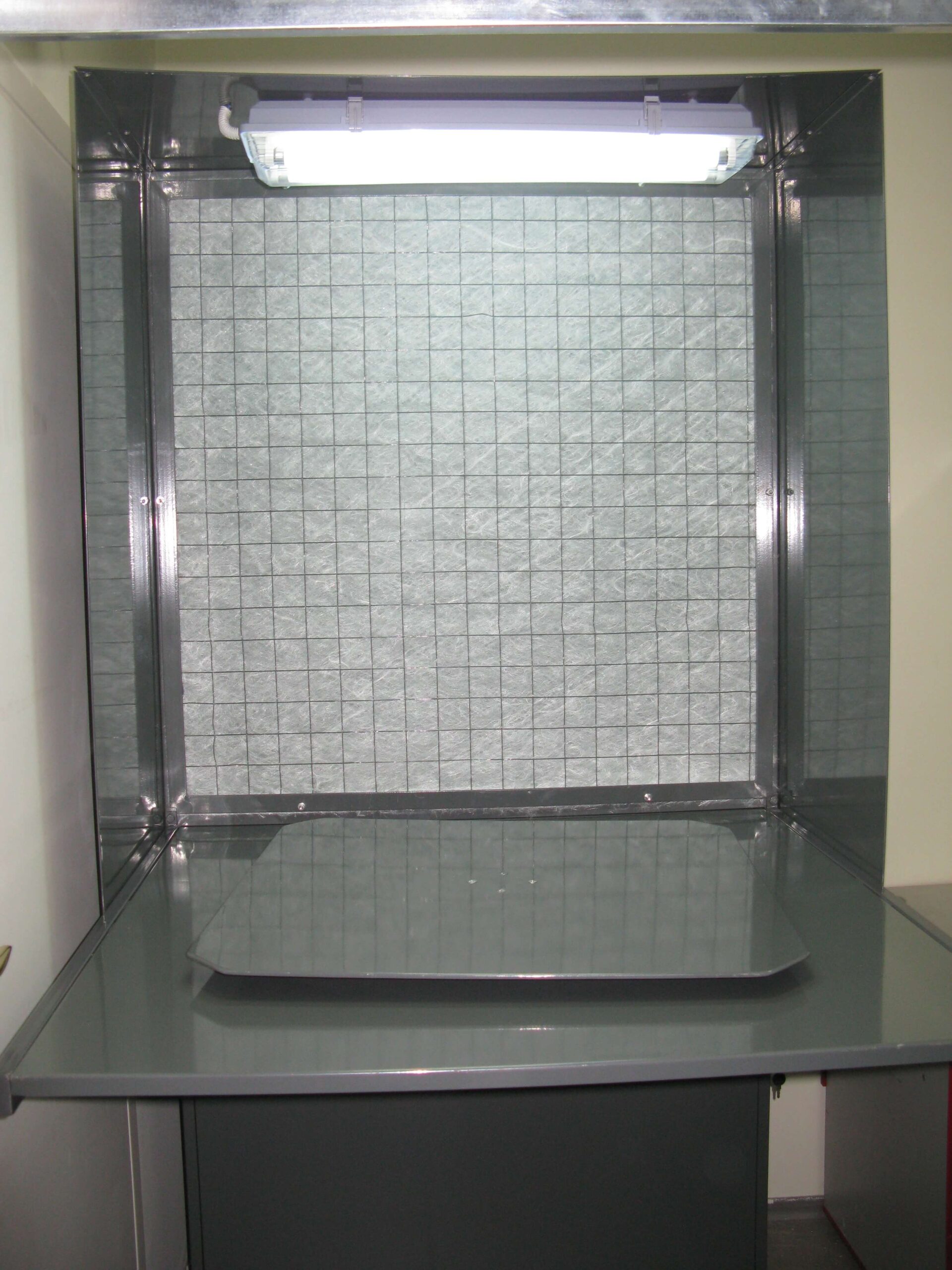- A paint booth with dry filtration, ASS-Cabin-1 series. The booth is made of a metal frame with profile pipes and angles, covered with a protective paint coating. Equipped with a rotary table for ease of working with exhibition samples. The ventilation unit with an electric motor provides a capacity of 1,500 m³/h, creating a uniform airflow. A removable filter cartridge with an exhaust filter and metal restrictors minimizes PCM dispersion in the room. A dual-lamp luminaire above the cartridge provides lighting for accurate coating quality assessment.