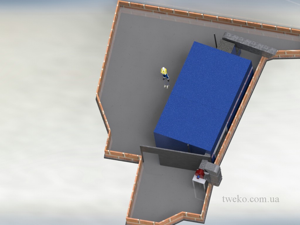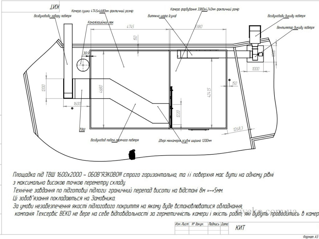 The painting complex consists of a coating chamber with dimensions 4x3x2,4m and a drying chamber with dimensions 5x3x2,4m, two chambers are connected by one common wall and have adjacent gates, air heating – electricity.