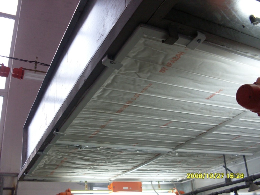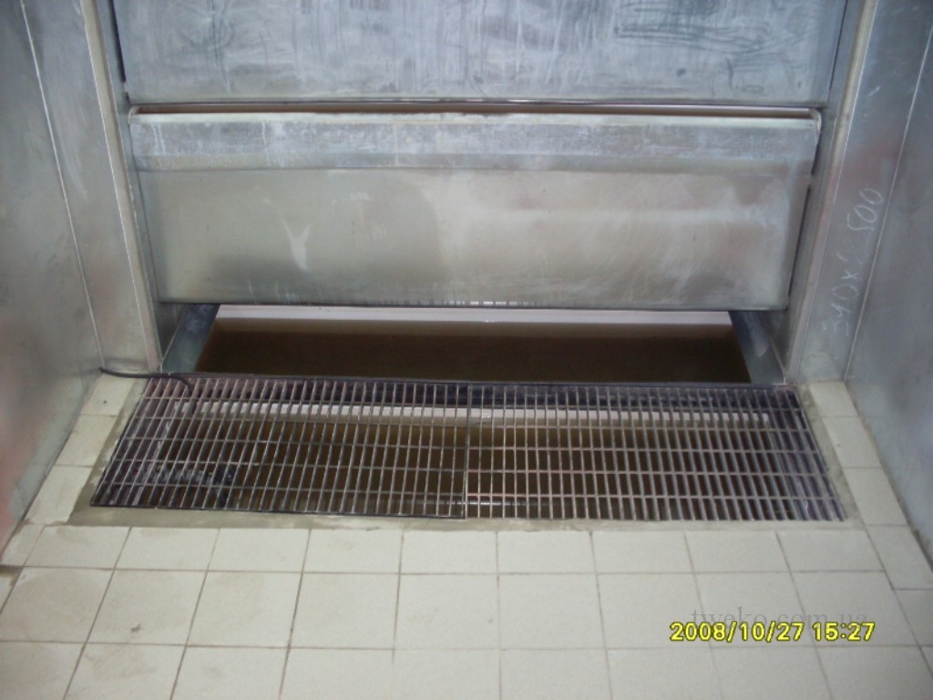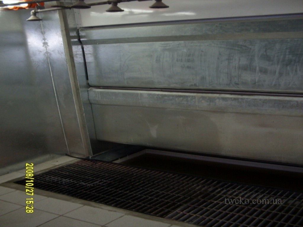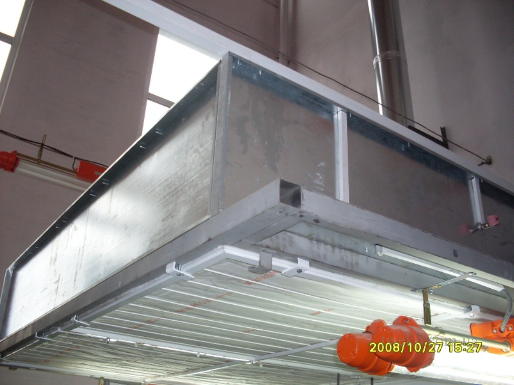 Paint station consisting of a supply ventilation group and a fume hood with a water curtain, electric heating of the air. A fume hood is built into the floor, the intake bath grilles are on the same level as the floor.