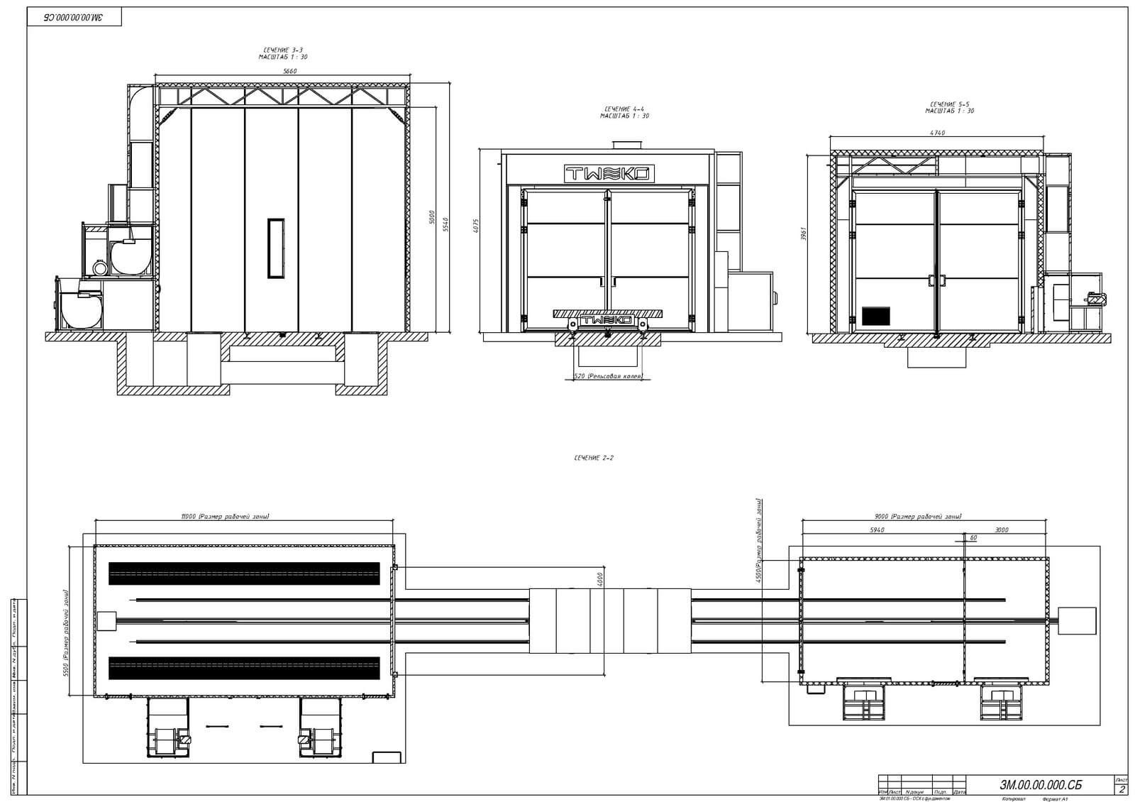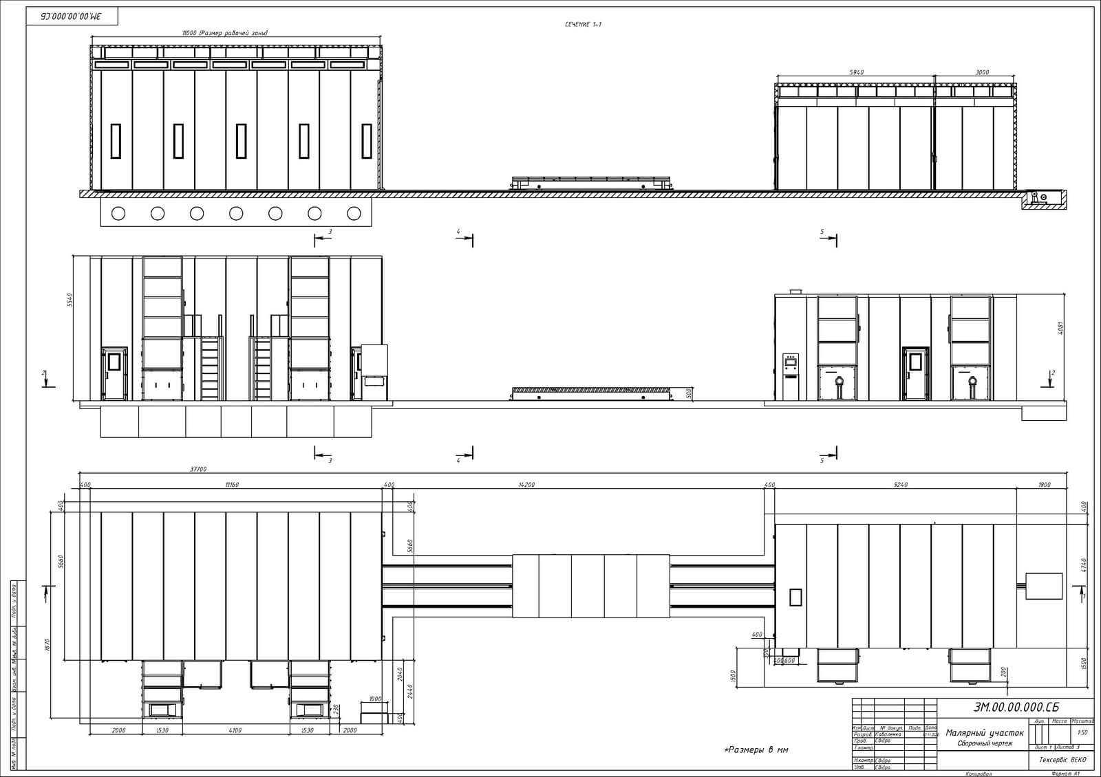 - Painting and drying chamber with dimensions (L × W × H) — 11160 × 5660 × 5540 mm.