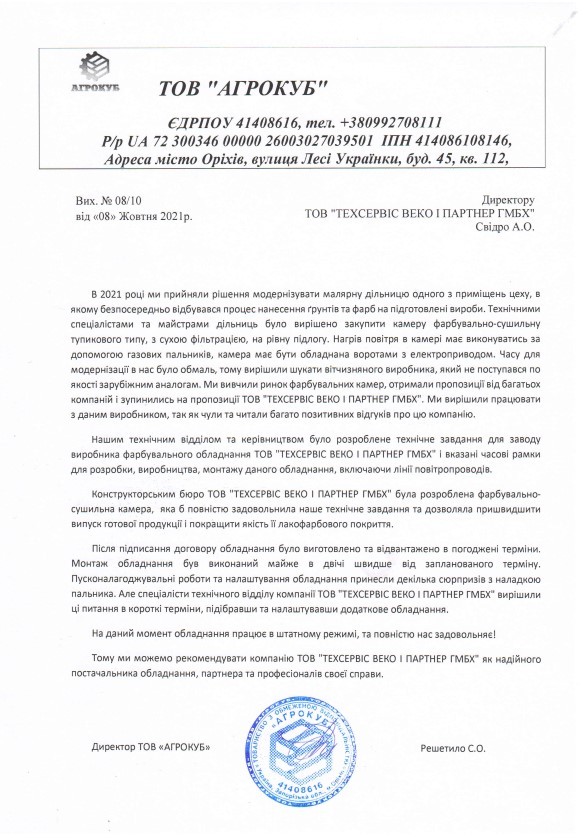 Thanks to the efficient work of the sales department of our company, we got acquainted with the company AGROKUB LLC. During further communication with the management and the technical department of this company, it was found out what equipment for the painting area they need to develop and improve the painting line.