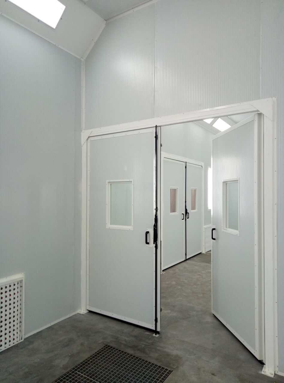 - Drying Chamber: With work zone dimensions of 9,880 × 6,700 × 2,700 mm. The thermo-ventilation group includes one supply-exhaust cabinet with a single centrifugal ventilation unit, providing air circulation with partial renewal (10–15%) to prevent explosive environments while minimizing heat loss. The chamber has its own gates and a gate connecting to the painting chamber.