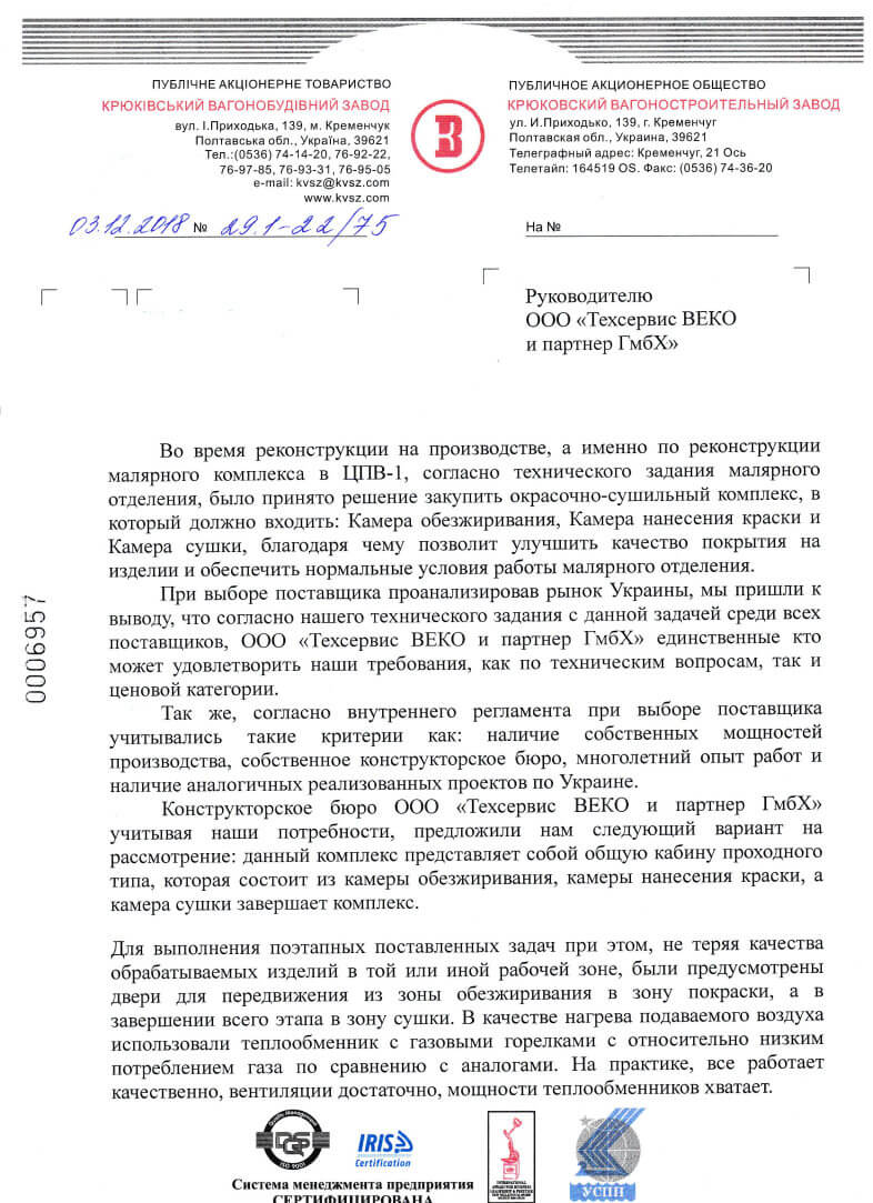 In December 2018, PJSC Kremenchuk Carriage Works received a new painting and drying complex from Techservice VEKO and Partner GmbH. The equipment fully meets modern wagon-building requirements, ensuring high coating quality and increasing production efficiency. During operation, the complex has performed reliably with no issues regarding quality or functionality.