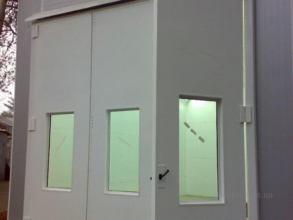 - Manufacturing of the steel booth structure with a gable roof and a door assembly with an upper sliding roller.