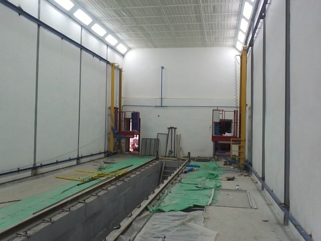 - Design of a painting and drying chamber integrated into an existing facility with three solid walls and a railway track along the facade.